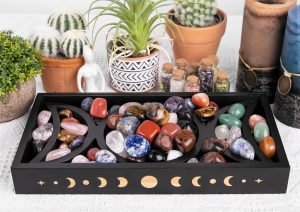 Decor Crystal Display Moon Tray Tarot Card Holder Stand, Wiccan Decor & Witchy Accessories & Pagan Altar Supplies, Black Wooden Storage Organizer Box for Rocks Healing Stones Jewelry Home Decorative